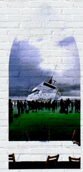 Im Hintergrund des Bildes ist das gestrandete Fährschiff vor einem hohen Himmel zu sehen, nach rechts geneigt, verlottert. Es wäre mehr als nur ein neuer Anstrich nötig, um es wieder flott zu machen. Der Himmel darüber wird von hinten her grau, eine aufziehende Regenwand. Allerdings sieht man ganz am Rand doch noch einen Silberstreif am Horizont, der die triste, trübe Stimmung auflockert. Bemerkenswert ist der Funkmast des Schiffes: In Kreuzesform ragt er neben dem Radar in den Himmel hinein.